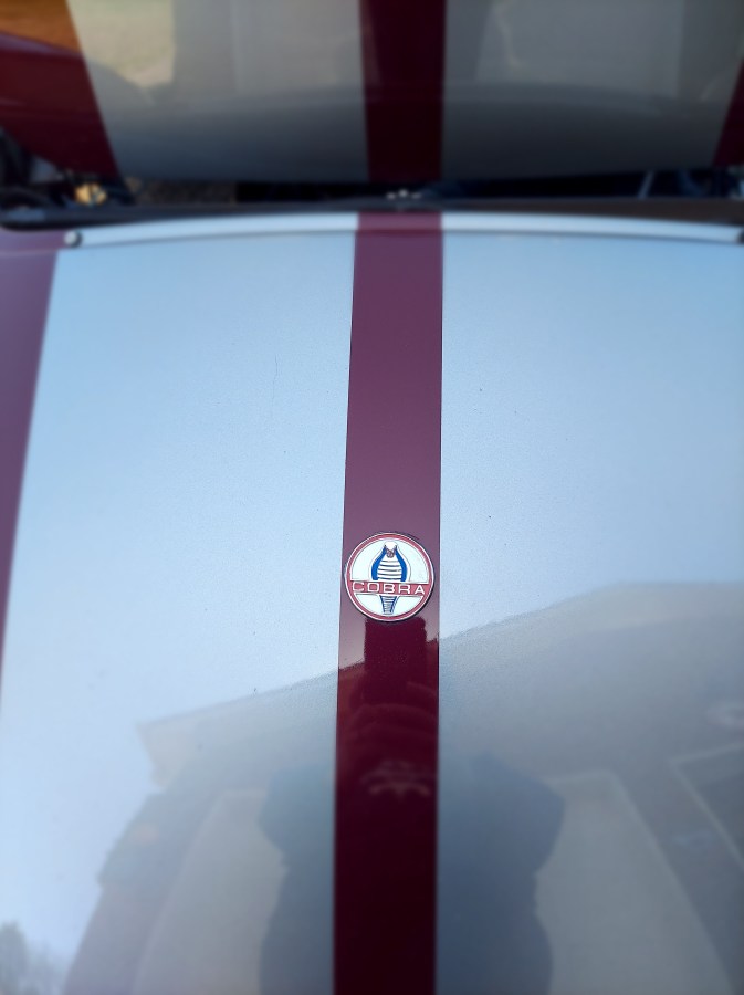 “No, Buddy, it won’t hurt you. That’s just an emblem with the Cobra brand name of Dad’s race car on it. Look at those exhaust pipes snaking out from underneath!”