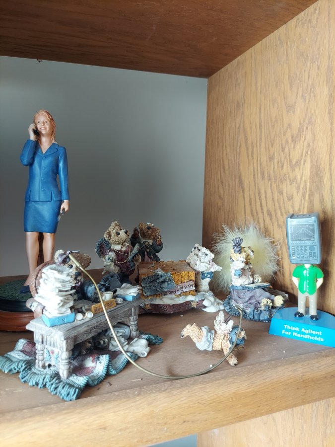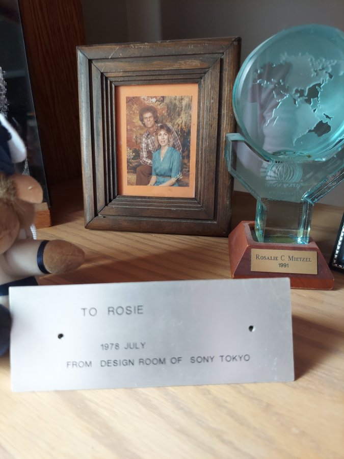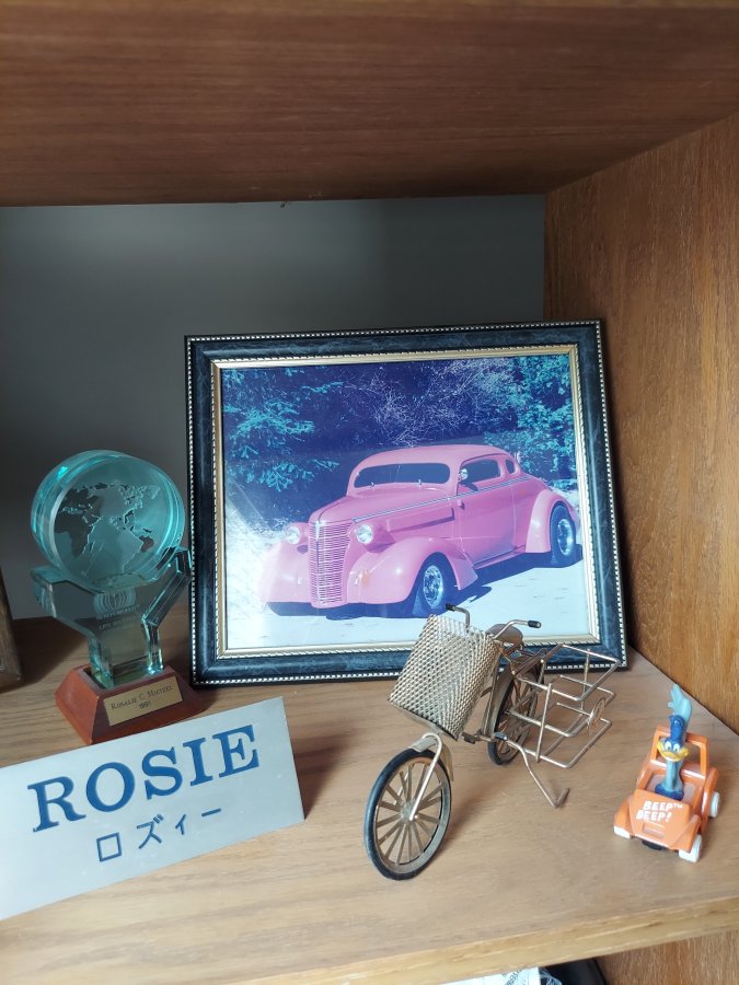 “This is another of Dad’s hotrods. He really likes this one a lot and has had it since 1996! And the sign that says ‘ROSIE’ was given to me by nice people from SONY Japan that I worked with. The Japanese letters tell them how to pronounce my name phonetically. And the glass trophy award was given to me at Realty World. “