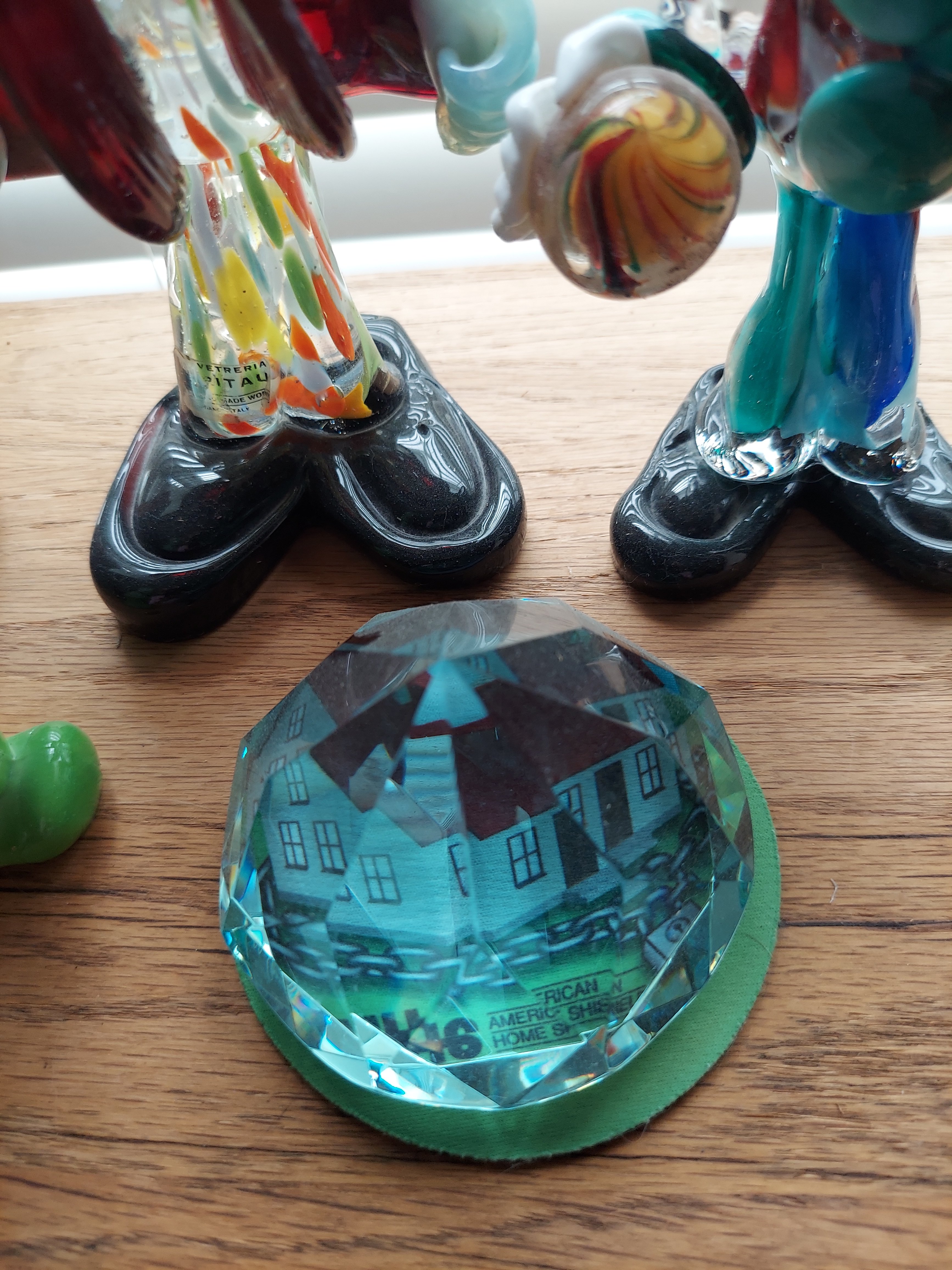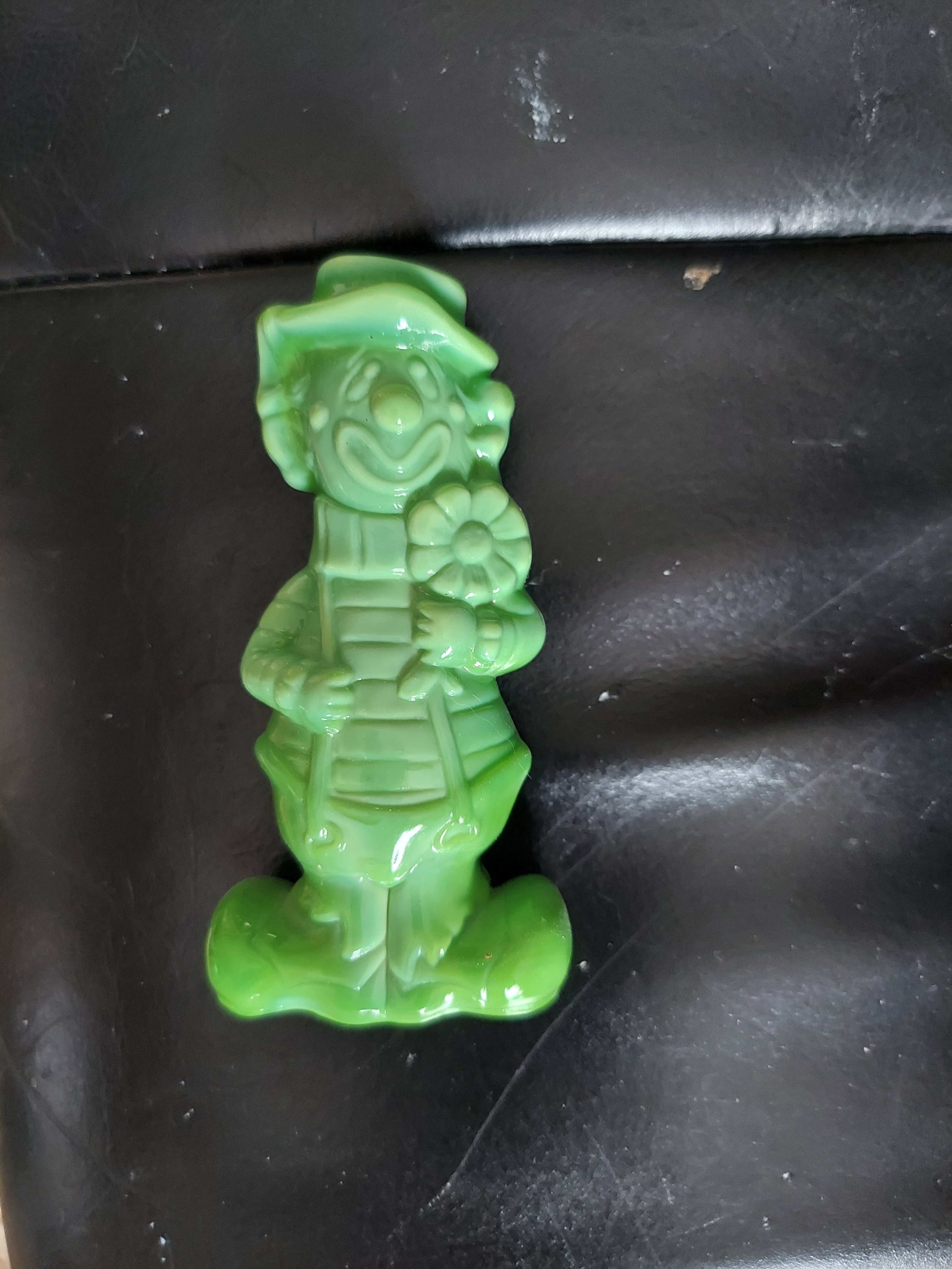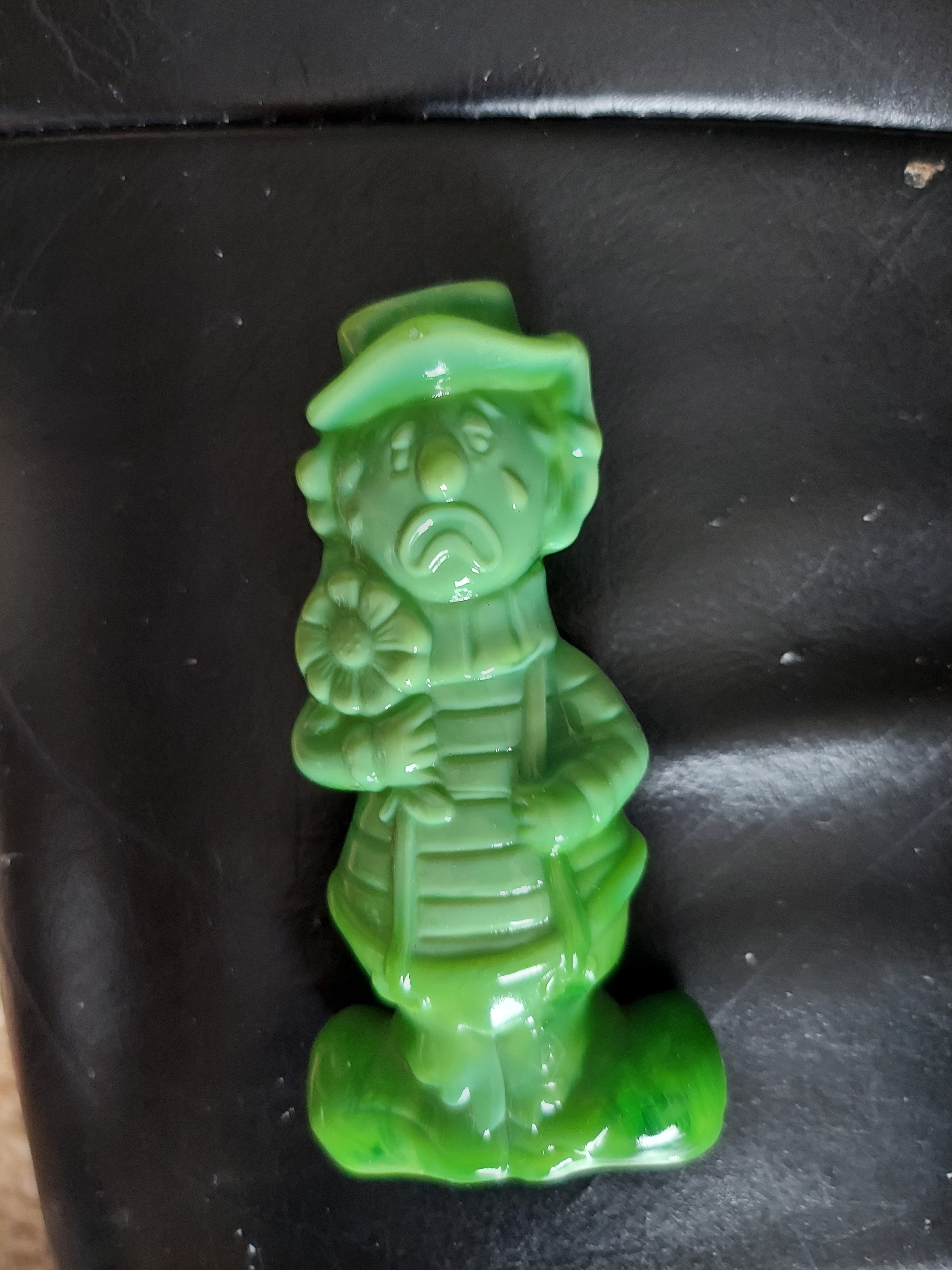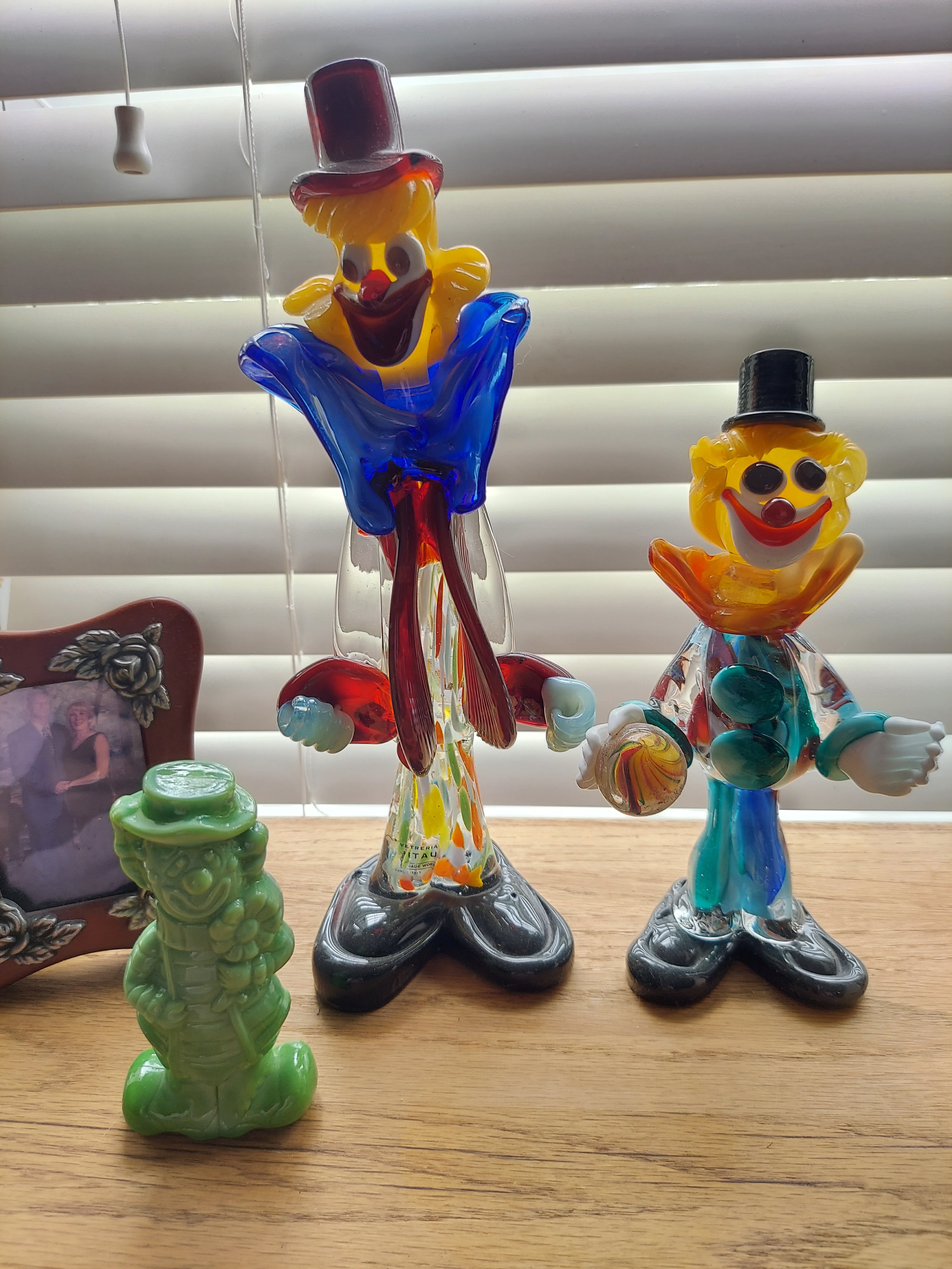 “These are my clowns. The green one has 2 sides – one is a happy face, one is a sad face. I turn it around depending what my mood is!”