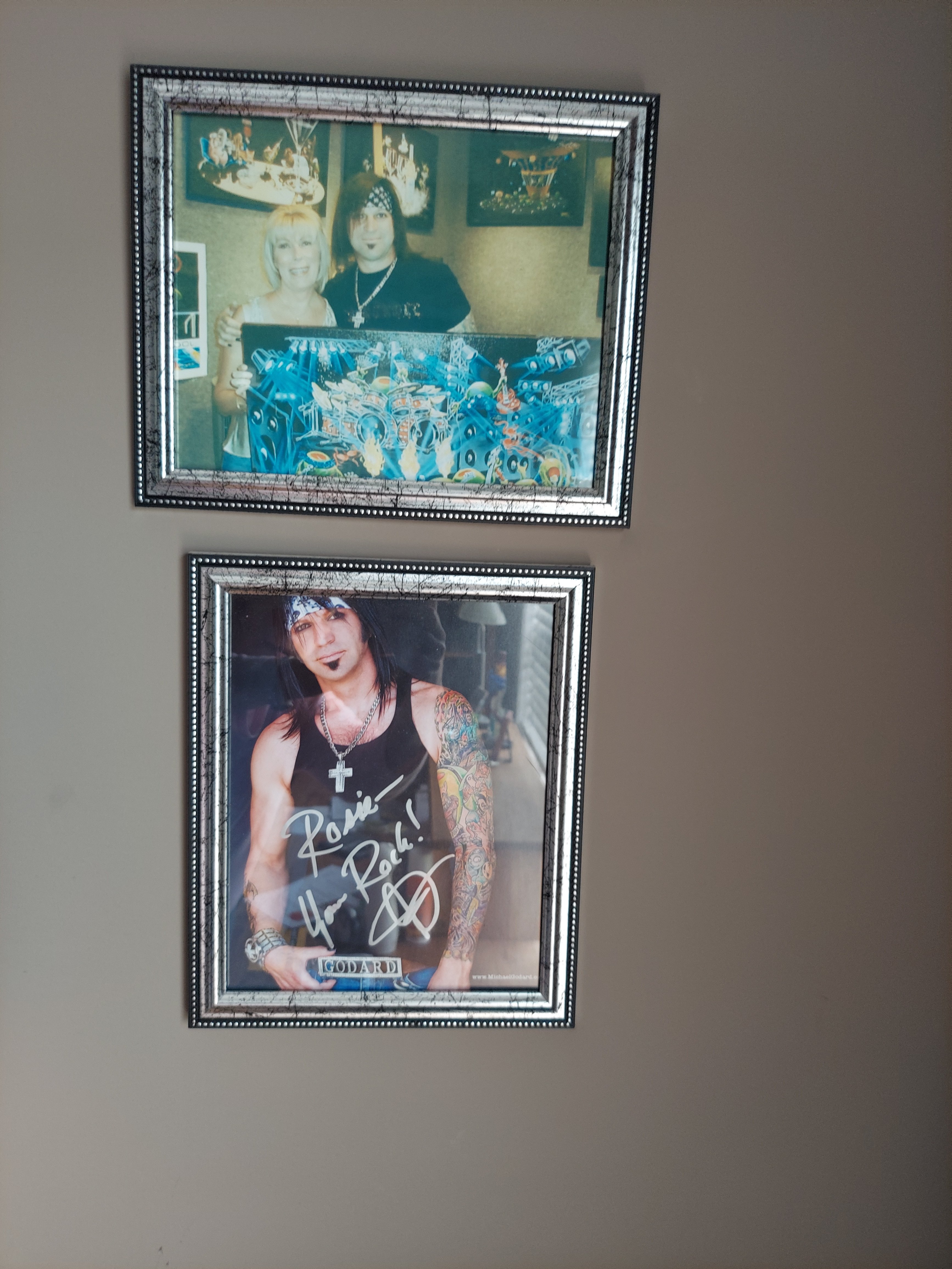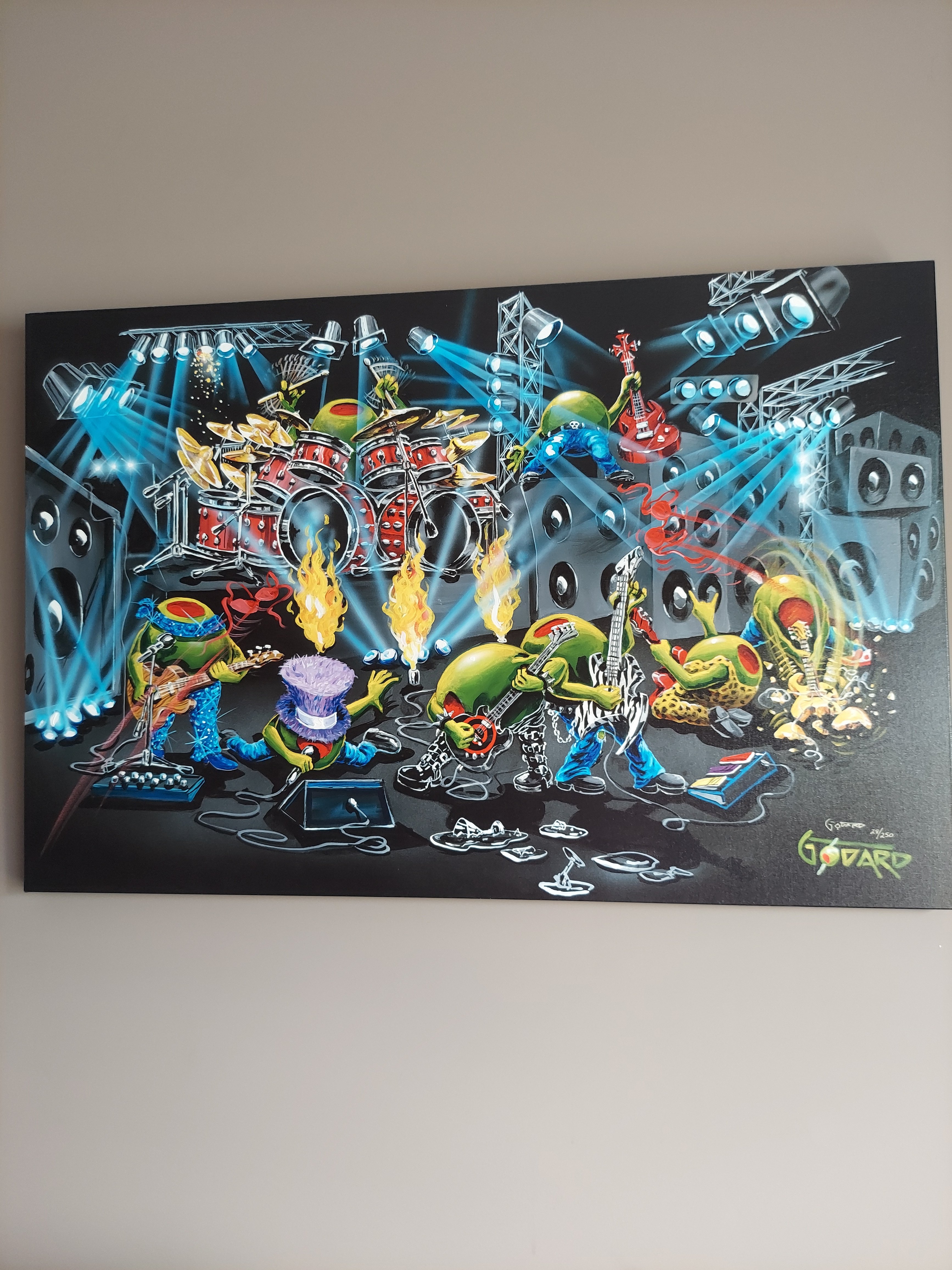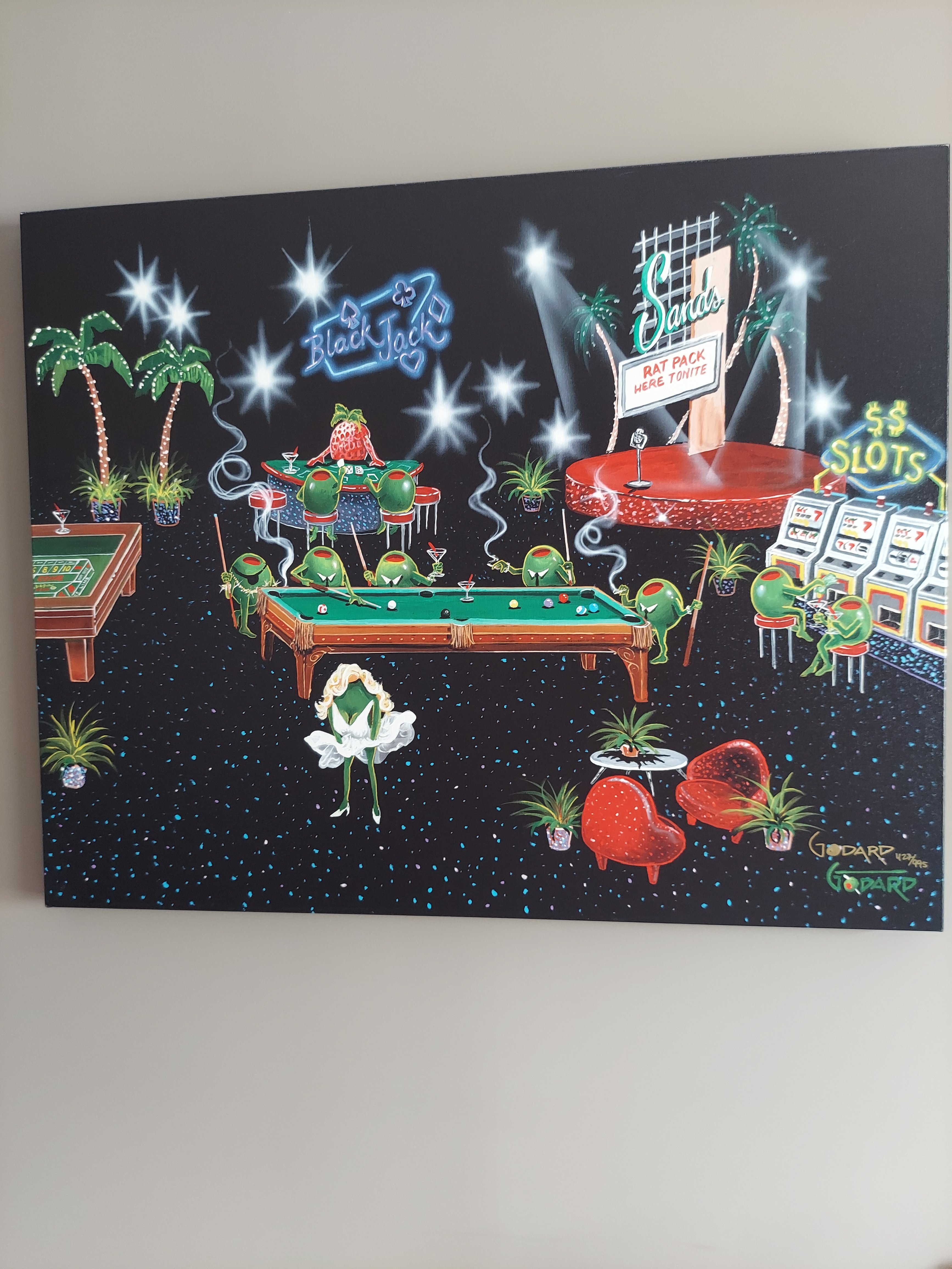 “He is famous and painted these. His name is Michael Godard. The picture I am holding in the photo with him is called “Party Like A Rock Star” and is hanging on the wall above my computer now. OK, time to get a little work done. Buddy, can you get some paper out of the cabinet for the printer?”