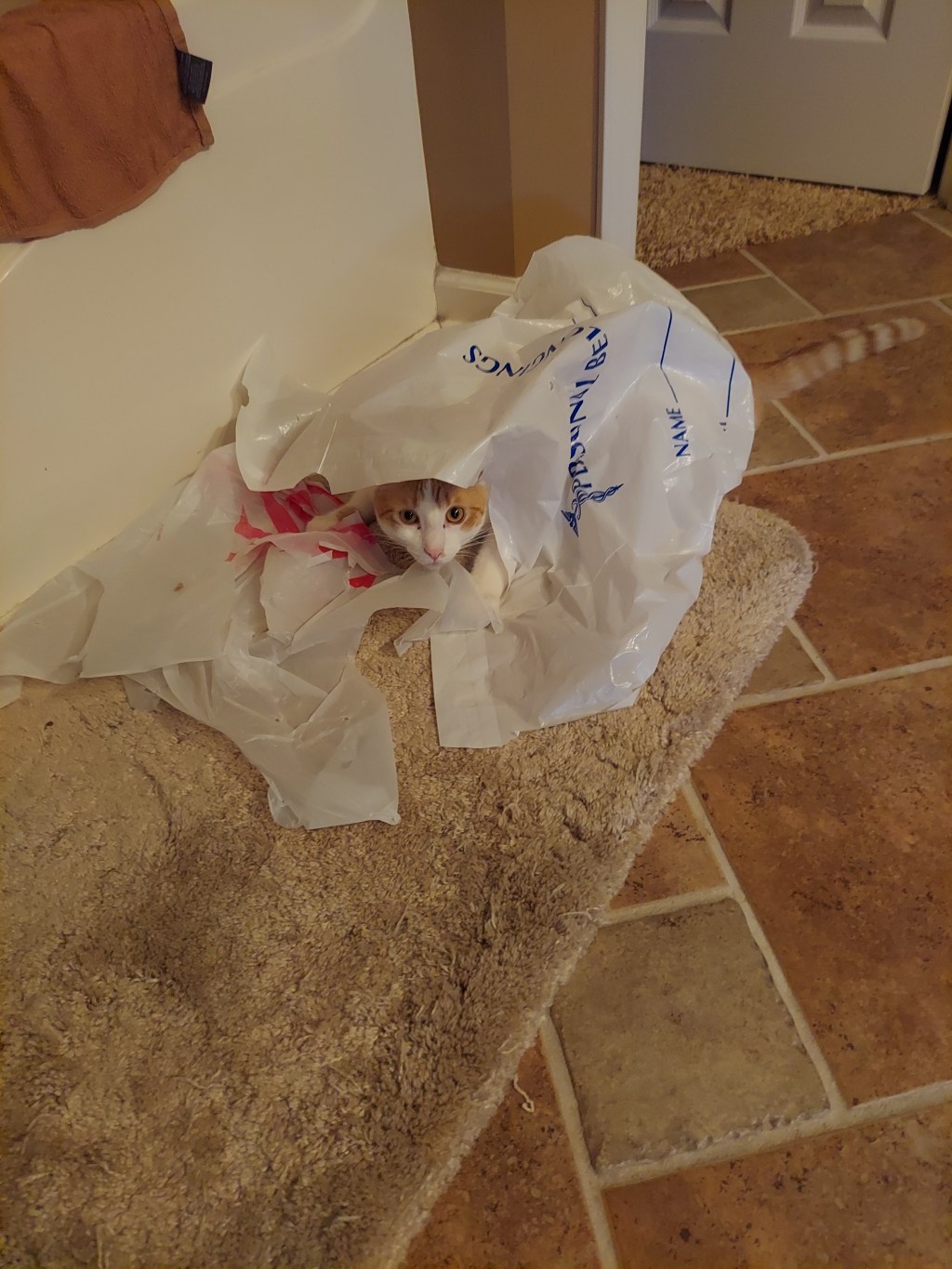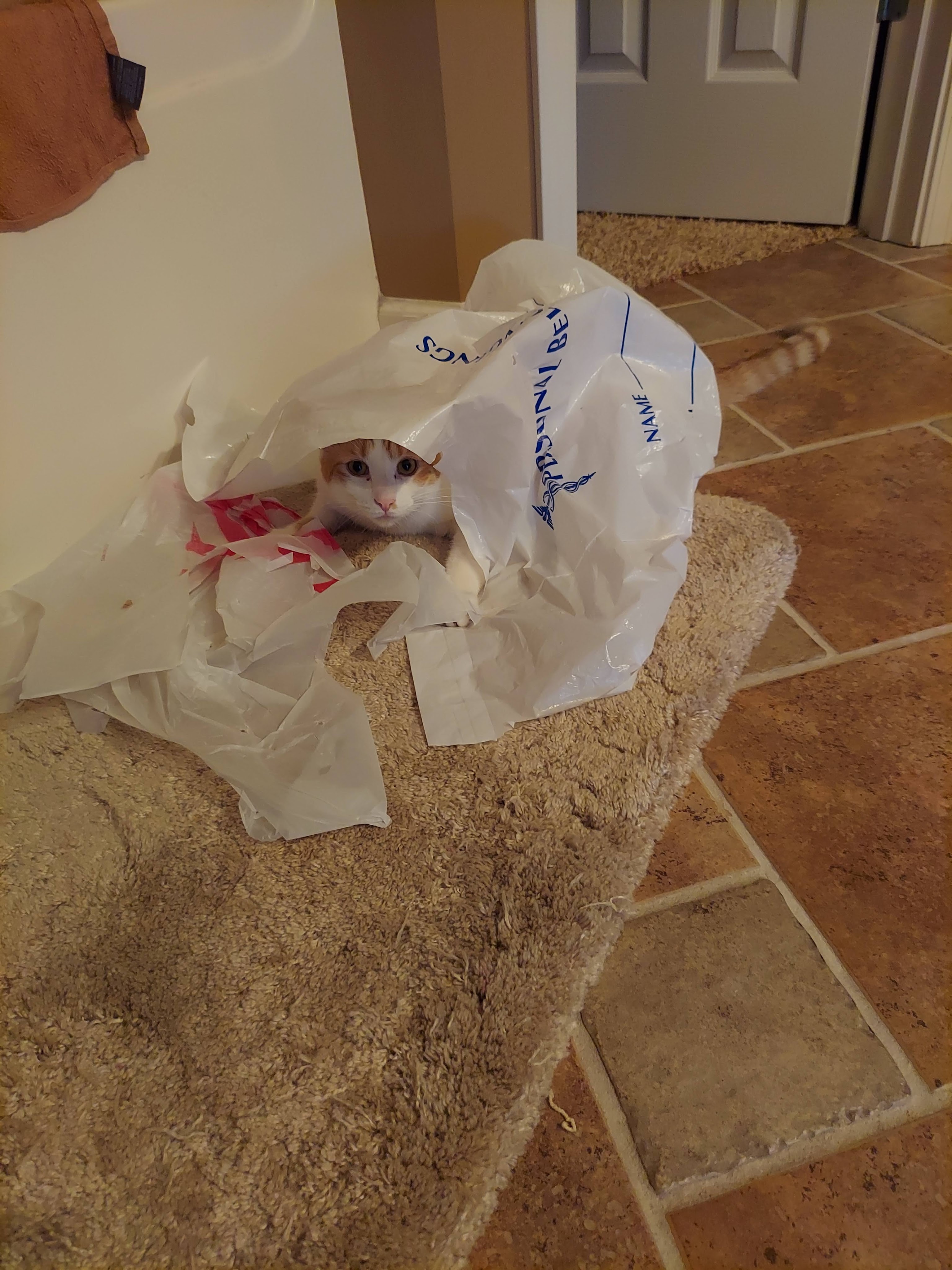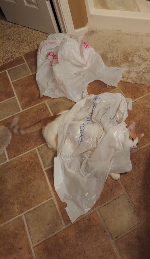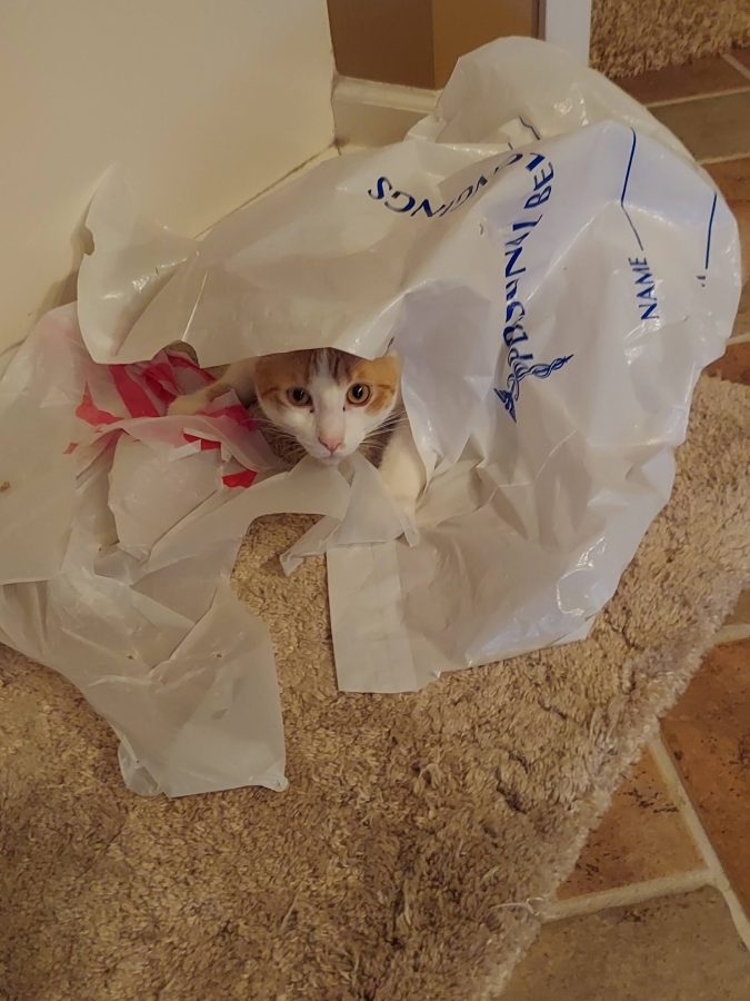 Once upon a time there was an orange & white cat named Buddy. He was a rescue kitten, a “car engine baby”, as they said. He was orphaned, brought to True Rescue, adopted, and has a fur-ever home playing with his step-brother, Crosby, and sometimes his aloof half-sister, Miss Junior. You can go to his page to read Buddy’s full story. But this is Saturday Funnies, a series of blog posts about the crazy antics of Crosby and Buddy. So, as they say…”on with the show“! (Disclaimer: all props in this story were made safe for cat play)