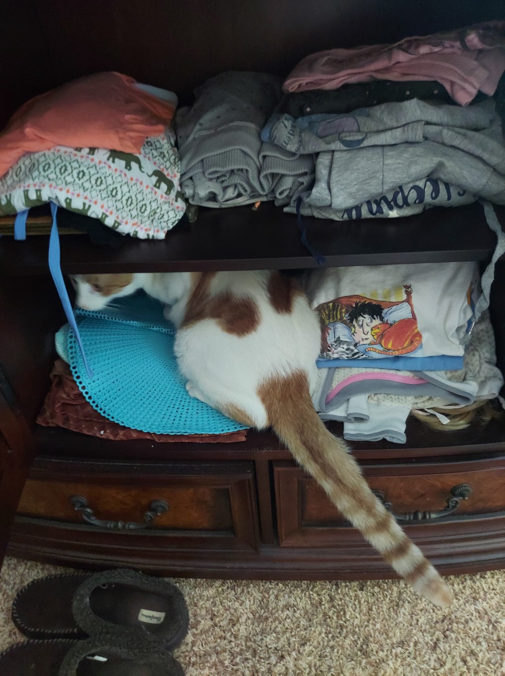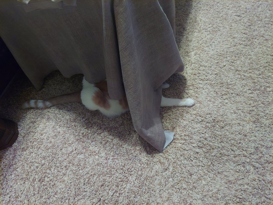 It’s Buddy in hiding! Sometimes it works – if his face is covered, Buddy thinks he is completely hidden and can jump out to surprise Crosby! Love their hide and seek games!
