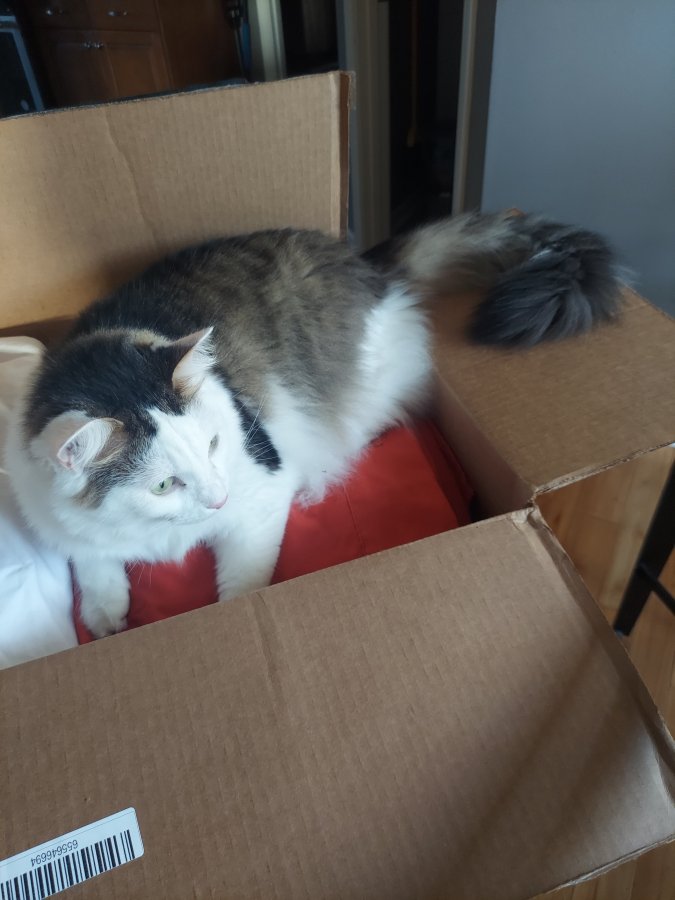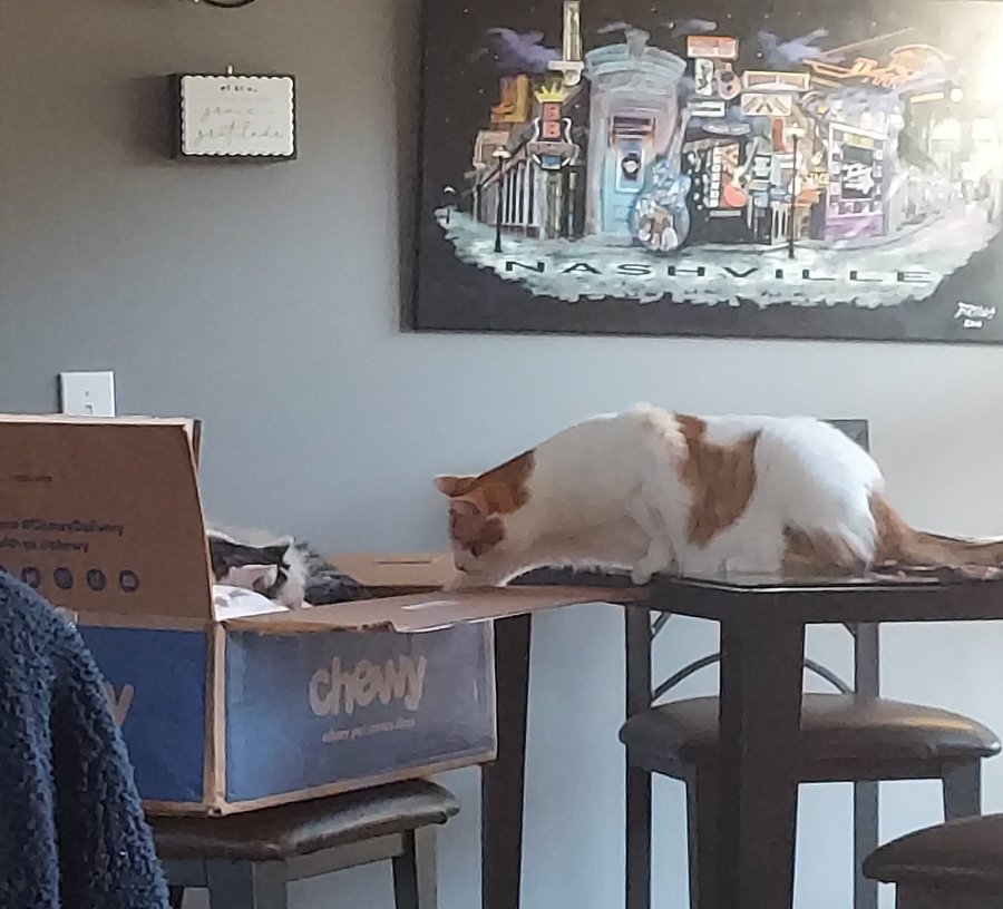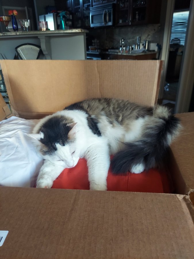 “Crosby, Mom just opened this box and you were sleeping inside! How did you get in there? Did Chewy ship you? It’s marked MAY BE HEAVY hee hee! “