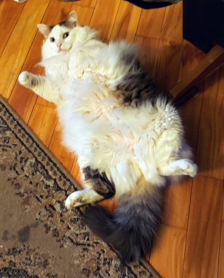 “Buddy, you’re not fat… you’re just a big cat! Rest assured, all cats have an abdominal flap, called a primordial pouch, that swings from side to side when they walk around. “