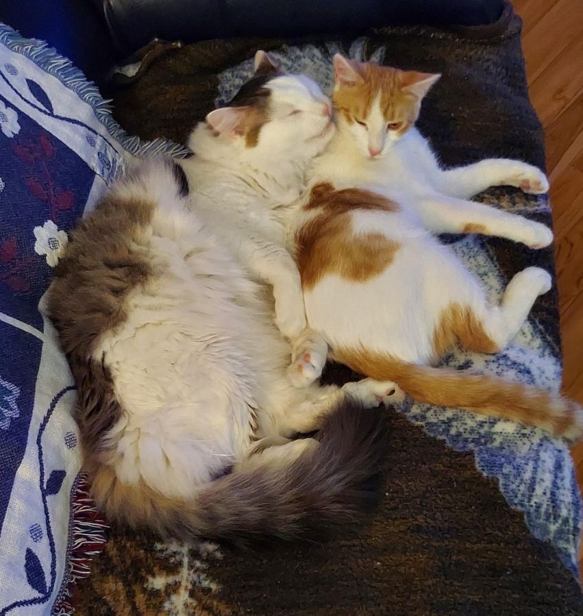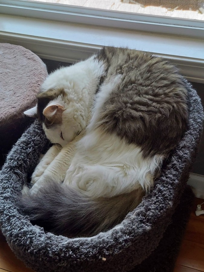 Thank you for the compliments! Buddy is as big as Crosby – took him to the vet last week and he weighed 15 lbs. He’s really long! Even Ted comments on how big he is. Crosby is our “pretty boy” and a cuddler. Nicky is doing good, still hides most of the day but eats well with the others, loves to be brushed, and cuddles alongside Ted most of the night. I’ve caught him up playing with the others at 6am some days! It’s who he is, and not knowing all the horror he experienced last year in the FL hurricane and dangling in a storm grate AND being a declawed community cat, we give him all the love we can and let him do his own thing. Hopefully he’ll start coming out abs hanging with us more. The TV voices seem to scare him, thinking strange people are in the house. But when it’s quiet, he comes out, sits on my computer desk when I’m working. Miss Junior is doing GREAT!! She’s around 14 now. After being gone for 38 days, she took awhile to recover. But now she still leaps up on windows ledges to get our attention, plays with toys a little, and tolerates the others when she’s inside eating/ sleeping. She’s a loner, but a great kitty. How is Emilie?
